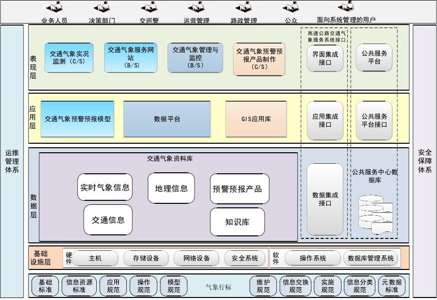 系统建设分为五大部分:交通气象信息数据库、交通气象实况监测子系统、交通气象预警预报子系统、交通气象服务子系统、监控与管理子系统。
