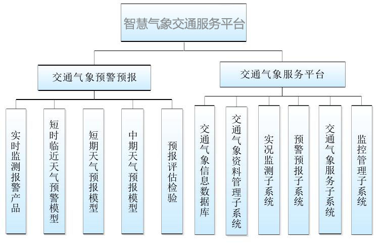 基于 GIS,集预报、监测和预警信息发布于一体的 交通气象服务平台,实现具有定量化、精细化与专业化的交通气象服务产品的发 布。服务平台包含两部分:交通气象预警预报和交通气象服务平台。交通气象预 警预报包括短时临近天气预警模型、实时监测报警产品、短期天气预报模型、中 期天气预报模型、中期天气预报模型等算法模型的开发,交通气象服务平台包括 交通气象信息数据库、交通气象服务、交通气象实况监测子系统、交通气象预警 预报子系统、系统监控管理子系统,研发目的是为全省的交通安全提供快速并且 高效的专业气象服务保障。