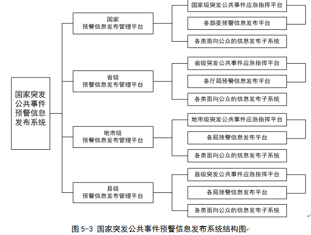 国家级突发公共事件预警信息发布管理平台:依托中国气象局原有的通信网络,补充部分网络安全设备,达到国家级预警信息发布管理平台与国家级突发公共事件应急指挥平台、省级预警信息发布管理平台的可靠连接,实现对国家级应急指挥平台预警信息的发布和信息管理及存储;并通过广播电台插播、手机短信、电视插播和突发公共事件预警发布网站等技术手段向各级预警信息发布管理平台和公众发布突发预警信息。