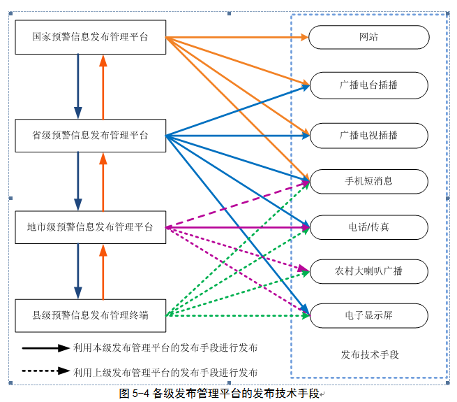 国家级突发公共事件预警信息发布管理平台及各级发布管理平台使用的发布技术手段如图: