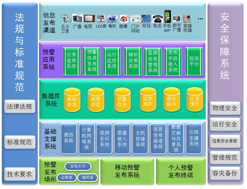 预警信息发布手段包括手机短信、12121及多路传真、网站、无线广播插播、电子显示屏、大喇叭、微博、电视台插播等发布技术手段。发布系统预警信息管理及发布系统总体结构见示意图。