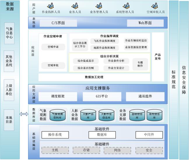 基础设施层提供人影作业指挥系统的基础软、硬件支撑平台,其中硬件部分包括了系统运行所必需的主机、存储设备、网络设备以及相关的安全系统等,软件部分则主要包含了系统运行所必需的操作系统、数据库系统等。